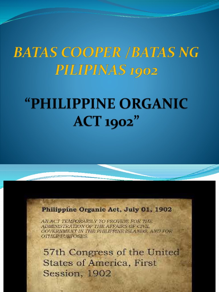 II LAYUNIN III TALAHULUGAN 2 Philippine Organic Act o Batas Pilipinas ng 1902 from COLLEGE OF 181558 at Mabini Colleges. Ngunit sa pagkakaroon ng batas ito ay gumanda at kahit papaanoy naging mapayapa. Ang Batas Cooper o mas kilala sa tawag na Batas ng Pilipinas ng 1902 ay isang batas na ipinatupad ng Estados Unidos sa Pilipinas noong 1902.